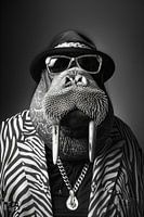 Ein ausdrucksstarkes schwarz-weiß Bild eines Walrosses in modischer Kleidung und Accessoires, die eine einzigartige Persönlichkeit hervorheben.