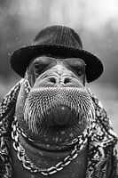 Ein ausdrucksstarkes schwarz-weiß Bild eines Walrosses in modischer Kleidung und Accessoires, die eine einzigartige Persönlichkeit hervorheben.