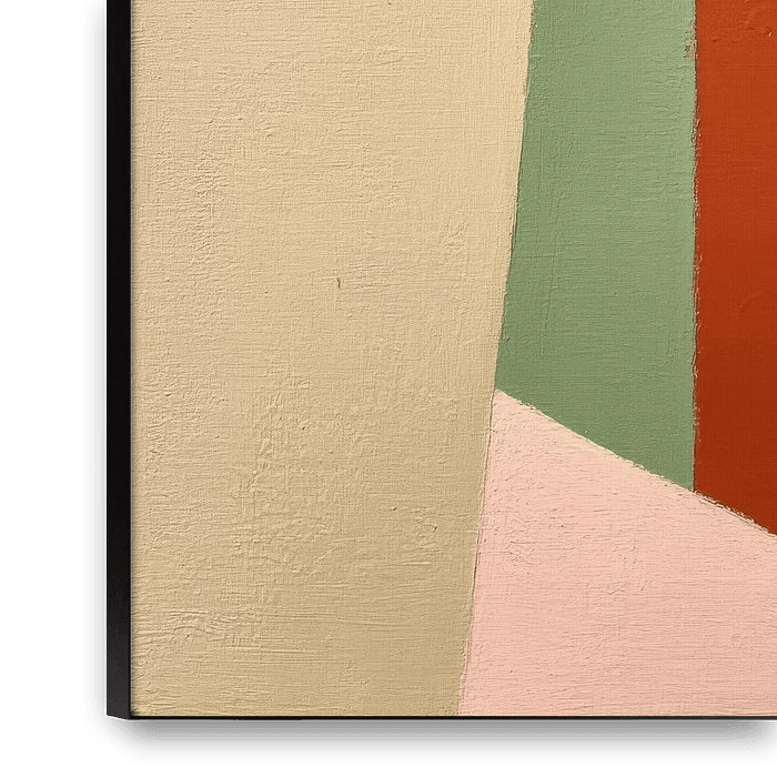 Ein abstraktes Gemälde mit pastellrosa, senfgelben und grünen Formen an der Wand. Die Farbpalette ist weich und warm. Eine kleine dunkelrote Form sticht in einer Ecke der Leinwand hervor. Es wirkt wie etwas, das als Kunstwerk in einer Wohnung oder einem Haus aufgehängt werden könnte. Es ist kein Text sichtbar.
