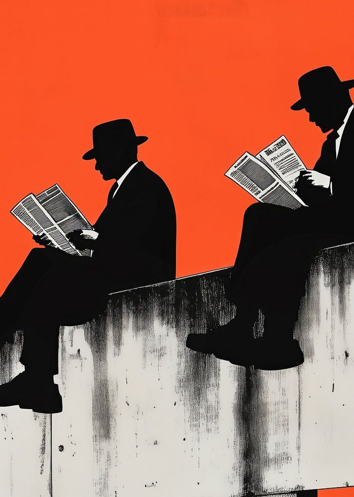 Ein Kunstdruck von zwei Männern in Anzügen und Hüten, die an einer Wand sitzen und jeweils eine Zeitung lesen