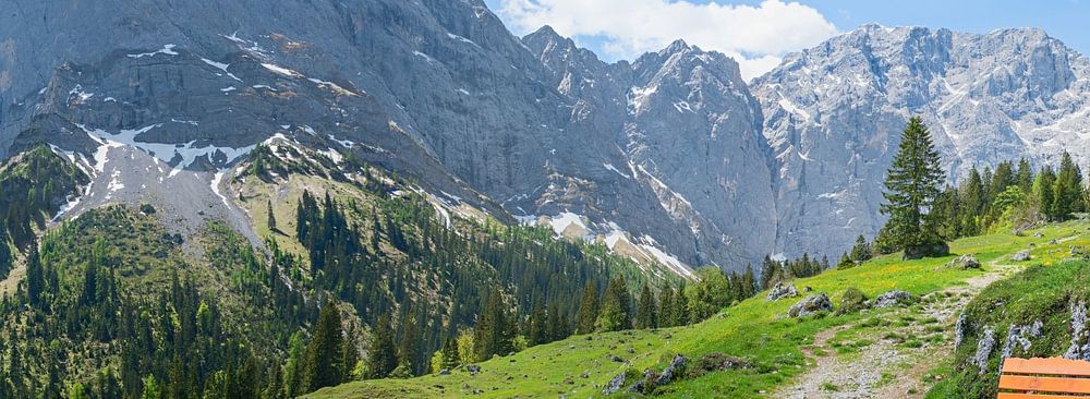 Wanderweg von der Eng zum Hohljoch im Karwendelgebirge. Alpenlandschaft in Tirol, Österreich. Rastbank am Weg.