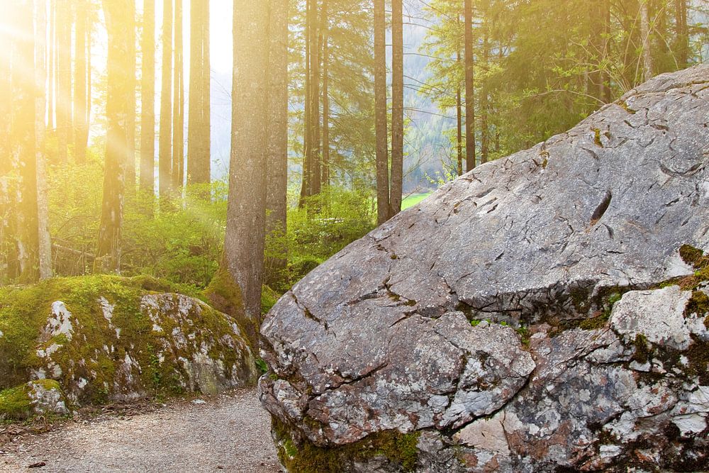 Wanderweg durch den Wald bei Sonnenuntergang