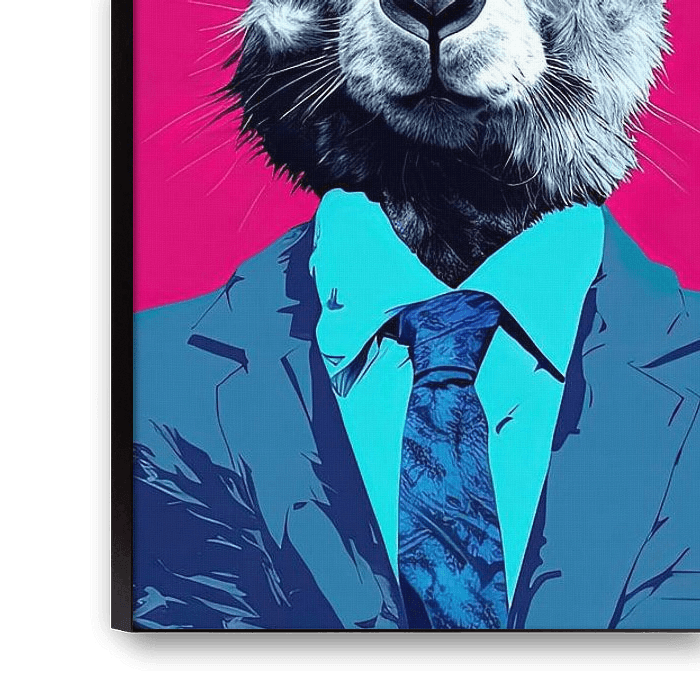 Jeder Hase trägt ein schickes Kostüm und eine Sonnenbrille, was ihm einen menschlichen Charme verleiht. Die kräftigen, kontrastreichen Hintergründe in leuchtendem Pink, Türkis und Orange verstärken den ausdrucksstarken Charakter der Kunstwerke. Die Sonnenbrillen, jede in einem anderen Farbton, verleihen ihnen einen Hauch von Geheimnis und Coolness. Diese Bilder sind nicht nur eine Hommage an Warhols künstlerisches Erbe, sondern spiegeln auch eine spielerische Verfremdung wider, die uns zum Nachdenken über die Beziehung zwischen Mensch und Tier und die Art und Weise anregt, wie wir Mode und Stil wahrnehmen.