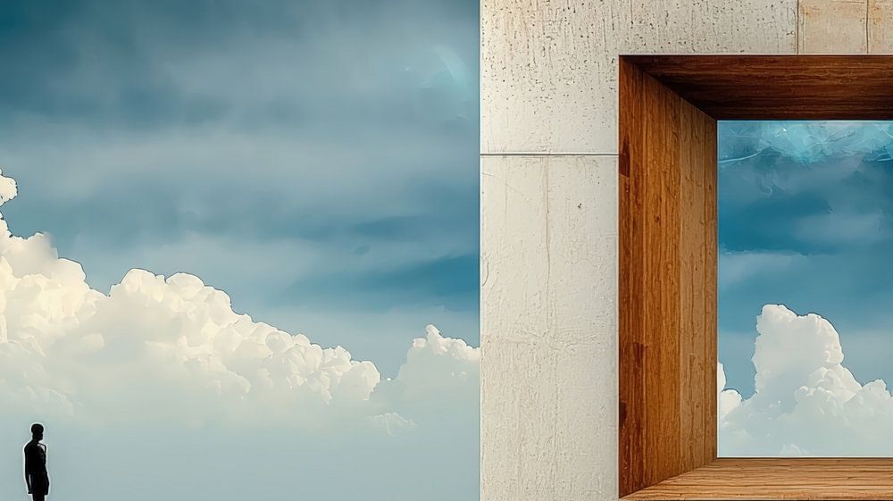 Das Bild entfaltet eine surreale Szenerie, die den Betrachter in eine Traumwelt entführt, in der geometrische Formen und Elemente der Natur miteinander verschmelzen. In der Mitte des Bildes befindet sich ein riesiger quadratischer Rahmen, der eine Öffnung in den Himmel bietet und den Blick in eine weite, wolkenverhangene Landschaft lenkt. Der Himmel ist voller bauschiger, weißer Wolken, die in weichen Kontrasten zum klaren, hellblauen Himmel stehen. Vor diesem Fenster zur Unendlichkeit scheint die Zeit stillzustehen.
