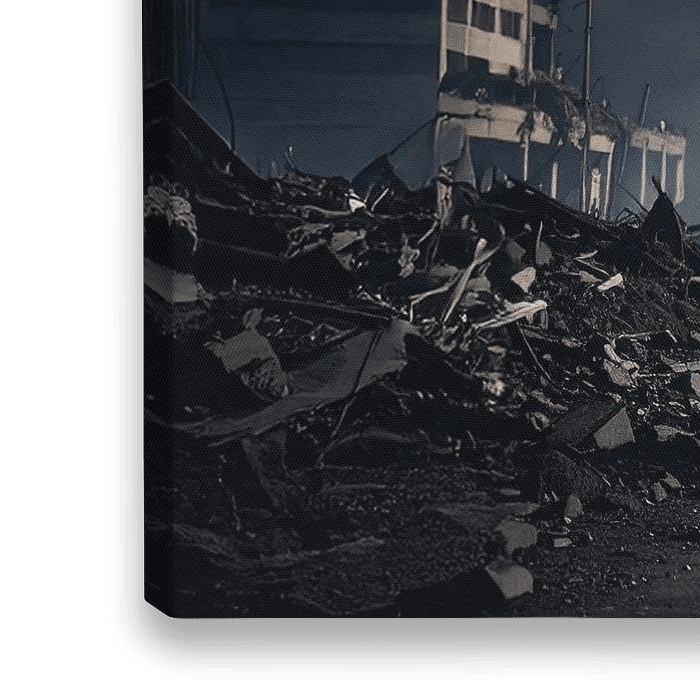 In diesem kraftvollen, symbolgeladenen Bild sehen wir ein Paar, das Hand in Hand durch die Ruinen einer zerstörten Stadt geht. Die Umgebung ist gezeichnet von Chaos und Zerstörung. Eingestürzte Gebäude, rauchende Trümmer, der Himmel verdunkelt von Rauchwolken- ein-post-apokalyptisches Szenario, das sowohl an Krieg als auch an…