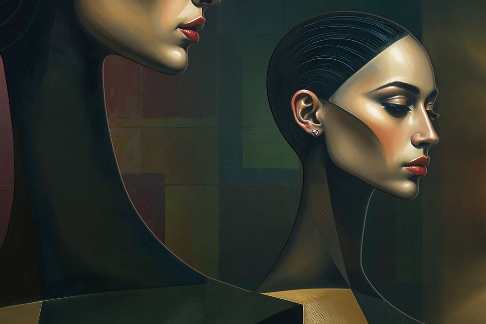 Das Werk spielt mit Abstraktion und Hochstilisierung, wobei geometrische Formen und menschliche Linien miteinander verschmelzen. Diese Kombination verleiht dem Kunstwerk eine zeitlose Qualität, während die zugrundeliegenden Emotionen erkennbarer menschlicher Beziehungen - Spannung, Erwartung und die Suche nach Verständnis - universell wirken.