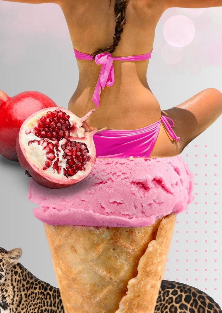 Dieses Design mit schönen, fröhlichen Farben, einer Frau in einem leuchtend rosa Bikini und einem Erdbeereis beschreibt visuell diesen glückseligen, warmen Tag.
