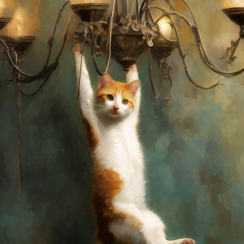 Klassisches impressionistisches Porträt einer schelmischen Katze, die an einem Kronleuchter hängt.
