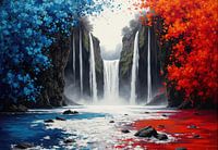 Ein Gemälde zeigt einen Wasserfall, der in ein Becken stürzt, das in eine blaue und eine rote Hälfte geteilt ist, flankiert von Felsen, die mit blauen und roten Ahornblättern bedeckt sind. Der Kontrast zwischen den kühlen und warmen Farben ist beeindruckend.