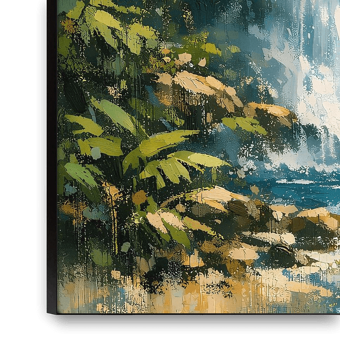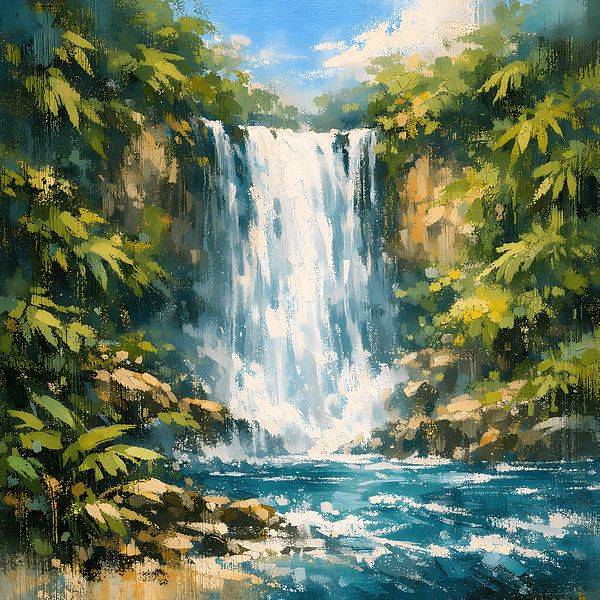 Ein lebendiges Naturgemälde, das einen kraftvoll herabstürzenden Wasserfall zeigt, umgeben von üppigem Grün und klar schimmerndem Wasser. Die dynamischen Pinselstrukturen und das Spiel aus Licht und Schatten verleihen dem Werk eine beruhigende, zugleich energiegeladene Atmosphäre. Ein ideales Kunstwerk für alle, die Ruhe,…