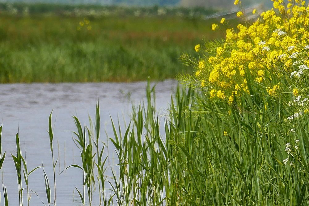 Eine Ente schwimmt in einem Graben in Waterland, nicht weit von Amsterdam. Am Ufer blüht die Rapssaat. Dieses Polderland ist noch unberührt, aber in der Ferne rückt die Großstadt vor.
