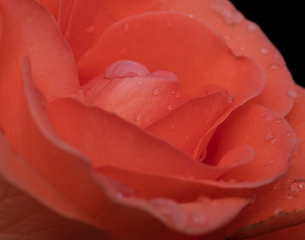 Der Hintergrund ist schwarz, so dass Ihr Auge auf die Details der Rose und der Tropfen gelenkt wird.