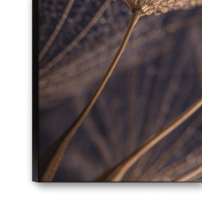 "Wassertropfen auf holzfarbenem Flaum" ist eine Makroaufnahme von Wassertropfen auf dem Flaum eines Tragopogon (Morgenstern). Dieses bearbeitete Foto besteht hauptsächlich aus den Farben: beige - braun - champagner mit einem dunklen Hintergrund. Die Schärfentiefe ist gering und schafft eine verträumte Atmosphäre sowie ein Gefühl von Tiefe in der Arbeit. Die Tröpfchen tragen ebenfalls zu dieser verträumten Atmosphäre bei, da sie das Licht reflektieren und dadurch ein Funkeln in den Tröpfchen zwischen den flauschigen Büscheln des Tragopogon erzeugen. Der Fokus des Bildes liegt auf dem Flaum in der Mitte. Assoziation: Ruhe, Zen, Wasser, Tropfen, Natur, abstrakt, Flaum, Ruhe, schick, rund, Kreis, Frühling, Frühling