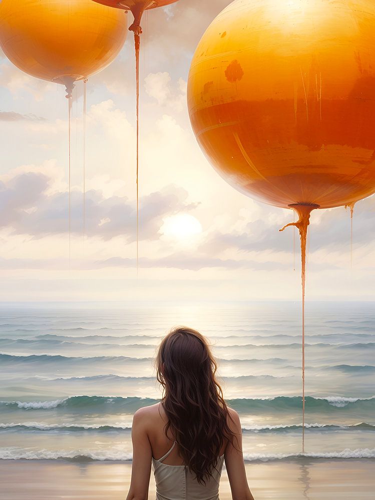 Das Bild zeigt eine Frau, die in einem weißen Kleid auf einem glatten, spiegelnden Strand sitzt, mit dem Rücken zum Betrachter. Sie blickt auf das Meer hinaus, wo ruhige Wellen gegen das Ufer rollen. Am Himmel schweben mehrere große orangefarbene Luftballons in unterschiedlicher Höhe. Die Stimmung des Bildes ist heiter und verträumt, mit einem weichen, warmen Licht, das an einen Sonnenaufgang erinnert. Die Spiegelung der Frau und der Ballons im Wasser verleiht dem Bild eine zusätzliche Dimension und lässt es fast surreal erscheinen.