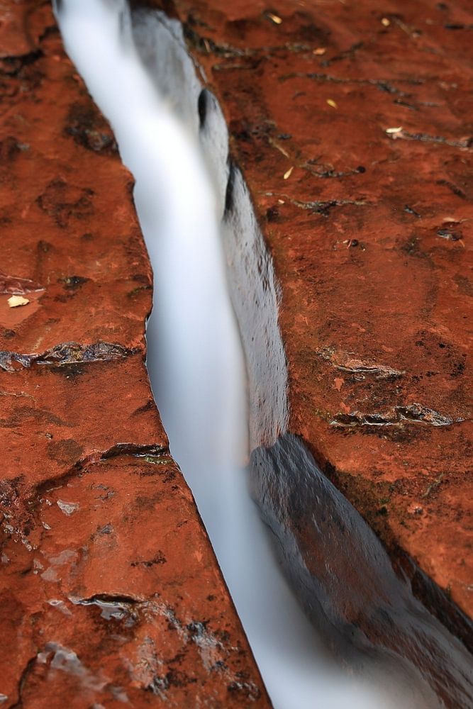 Water flowing through fissure in red rock, Zion National Park, Utah