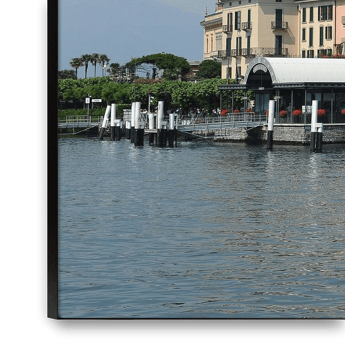 De waterkant in Bellagio. Bellagio is vooral bekend om zijn luxe hotels en winkels, speeltuin van de internationale jetset. Grand Hotel Villa Serbelloni ligt aan de linkerzijde van het beeld.
