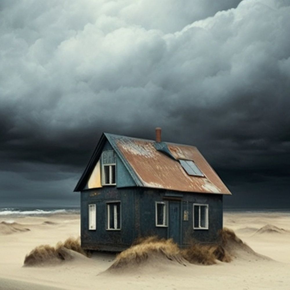 Ein einsames, kleines Haus mit einem rostfarbenen Dach steht inmitten einer weiten, sandigen Ebene, die an ein graues, aufgewühltes Meer grenzt. Der Himmel ist von schweren, dunklen Wolken dominiert, die eine unheilvolle Atmosphäre erzeugen. Das Haus wirkt verlassen und isoliert, umgeben von sanften Sanddünen. Die Szene strahlt eine melancholische Stille aus, in der die Kargheit der Landschaft auf die Bedrohlichkeit des Himmels und des Meeres trifft. Ein Lichtschein bricht vereinzelt durch die Wolken.