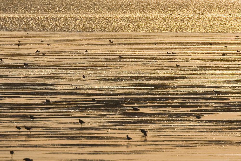 Watvögel im Wattenmeer bei Sonnenaufgang. Foto des niederländischen Vogelfotografen Marc Guyt. Ein Teil des Erlöses geht an einen guten Zweck zum Schutz der Vögel.