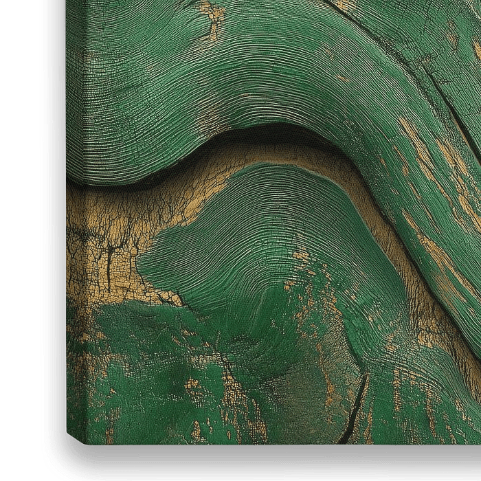 Dieses Kunstwerk zeigt ein organisches Muster aus gewellten Linien und Rissen in satten Grüntönen, die mit Goldakzenten versehen sind. Die Texturen scheinen die natürlichen Konturen von Holz und Erde widerzuspiegeln, was ein Gefühl von Bewegung und Tiefe hervorruft. Die Kombination aus verwitterten Elementen und glänzenden Details…