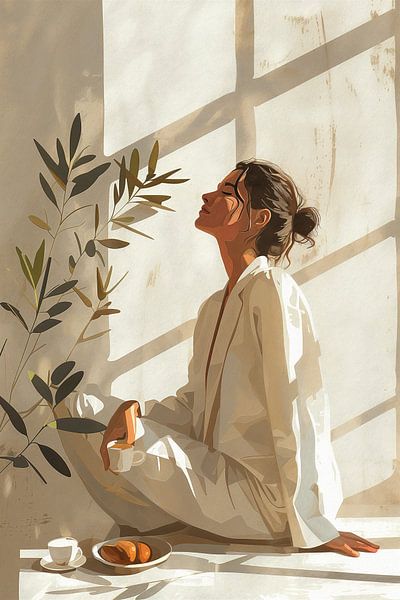 Porträt einer Frau, die mit dem Rücken zum Fenster sitzt und eine Tasse Kaffee genießt. Die sanften Pinselstriche und warmen Farben schaffen eine ruhige Atmosphäre und fangen die Ruhe und Einfachheit eines ruhigen Morgenmoments ein.
