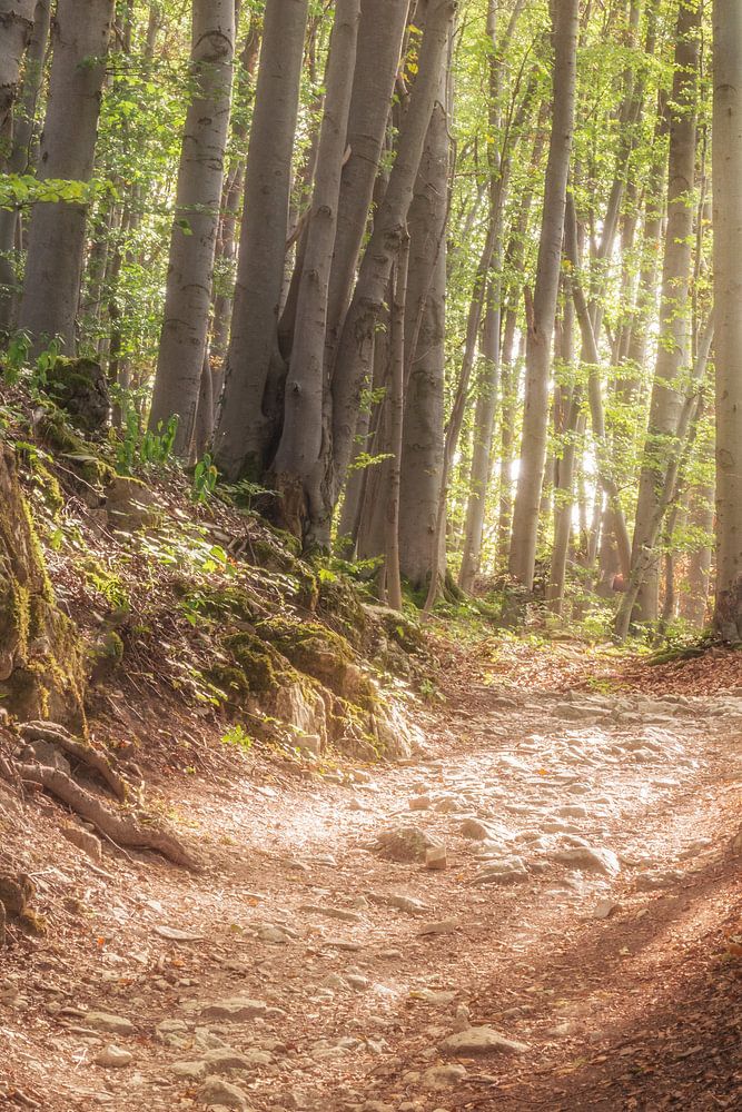 Ein steiniger Waldweg, der in das Morgenlicht führt.