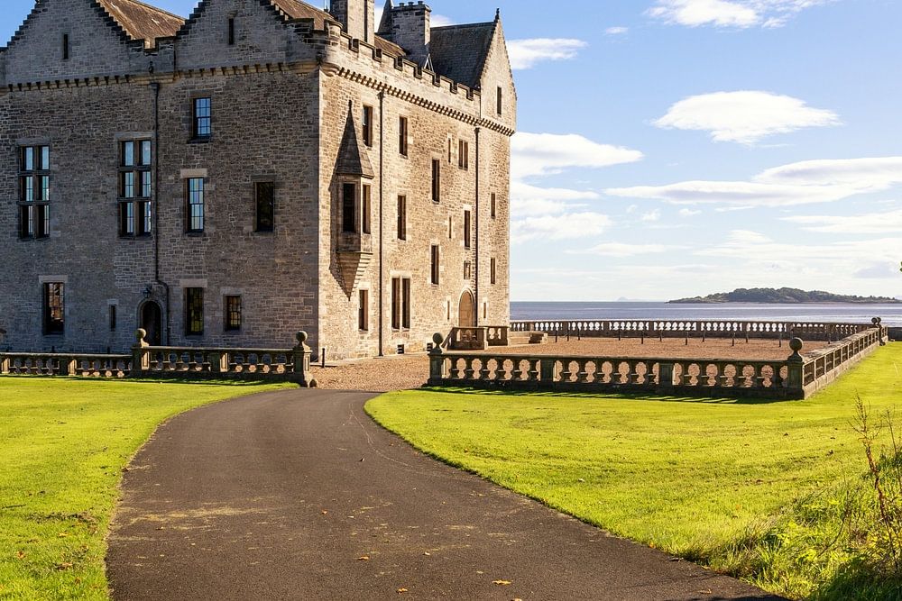 Das alte Schloss "Barnbougle Castle" befindet sich direkt am Meer in der Nähe von Edinburgh, Schottland