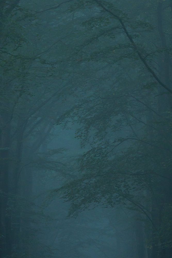 Auto im Nebel. An einem sehr frühen Morgen in der waldreichen Gegend von Gieten (Dr). Verträumtes Bild einer hohen Baumallee, mit einem der ersten Menschen auf dem Weg zur Arbeit. Stilbeispiel: die Gemälde von Simon Stalenhaug.