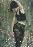 Weibliche Figur | Flüsternde Perlen und Gold - Dieses Frauenbild zeigt eine anmutige weibliche Figur mit Schmuck, drapiert in einem schwarz-dunkelgrünen Kleid vor einem mystischen Hintergrund mit goldenen und perlweißen Akzenten.