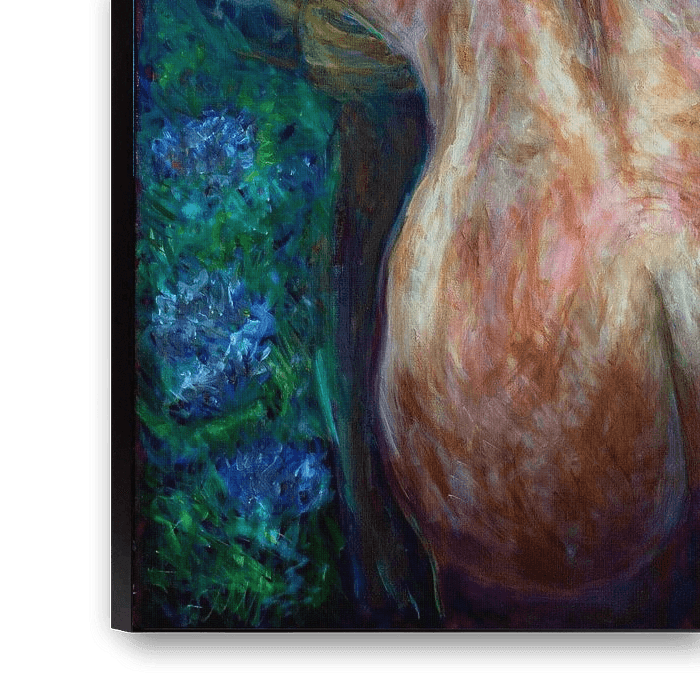 Der nackte Körper glänzt im Licht und reflektiert die Farben der Blumen. Es sieht aus, als wäre die Frau gerade aus dem Wasser gekommen. Trauen Sie sich, einen Akt an Ihre Wand zu hängen?