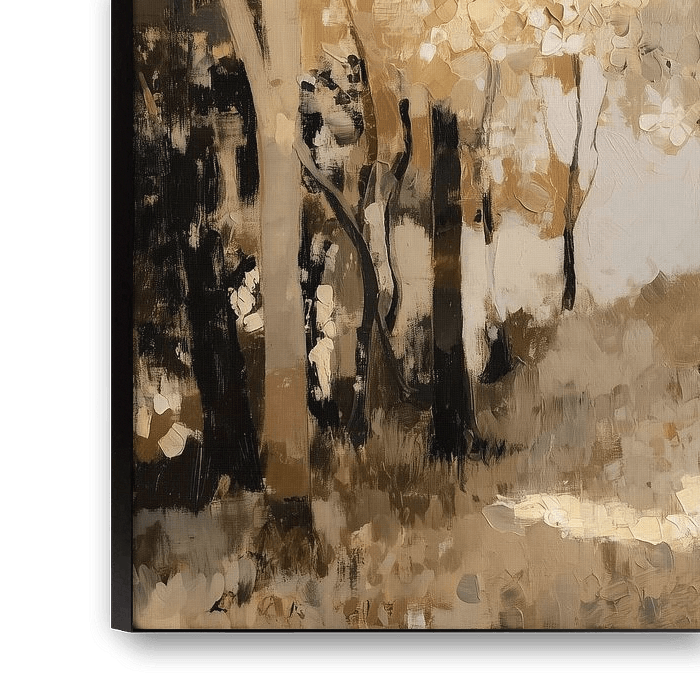 Ein impressionistischer Herbstwald, der in sanftes, goldenes Licht getaucht ist. Texturierte Pinselstriche und warme Erdtöne evozieren eine ruhige Gelassenheit - ein Moment zwischen Licht und Schatten, in dem die Natur in gedämpften Gold- und Cremetönen flüstert
