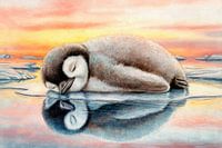 Ein flauschiges Pinguinküken schläft auf glattem Eis, während sich sein Spiegelbild gestochen scharf im ruhigen Wasser abzeichnet. Im Hintergrund färbt sich der Abendhimmel in sanften Pastelltönen, die einen warmen Kontrast zu den kühlen Eisschollen bilden. Dezente Federstrukturen und runde Formen verleihen dem Tier ein zartes Aussehen.…