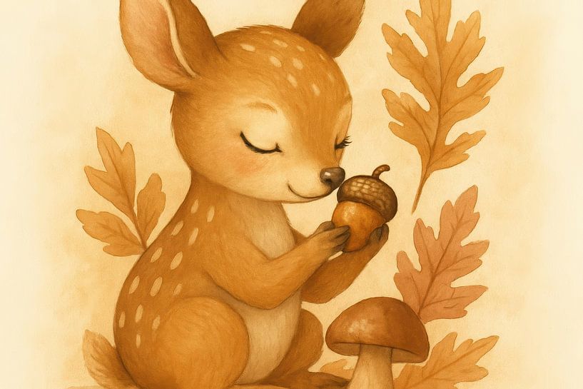 Ein verträumtes Reh hält eine Eichel fest an sich gedrückt, umgeben von weichen Herbstblättern und einem kleinen Pilz. Die runden Formen und subtilen Schattierungen verleihen dem Tier ein warmes, freundliches Aussehen. Die Farbpalette aus Sepia- und Brauntönen mit hellen Akzenten sorgt für eine ruhige, nostalgische Atmosphäre und einen…