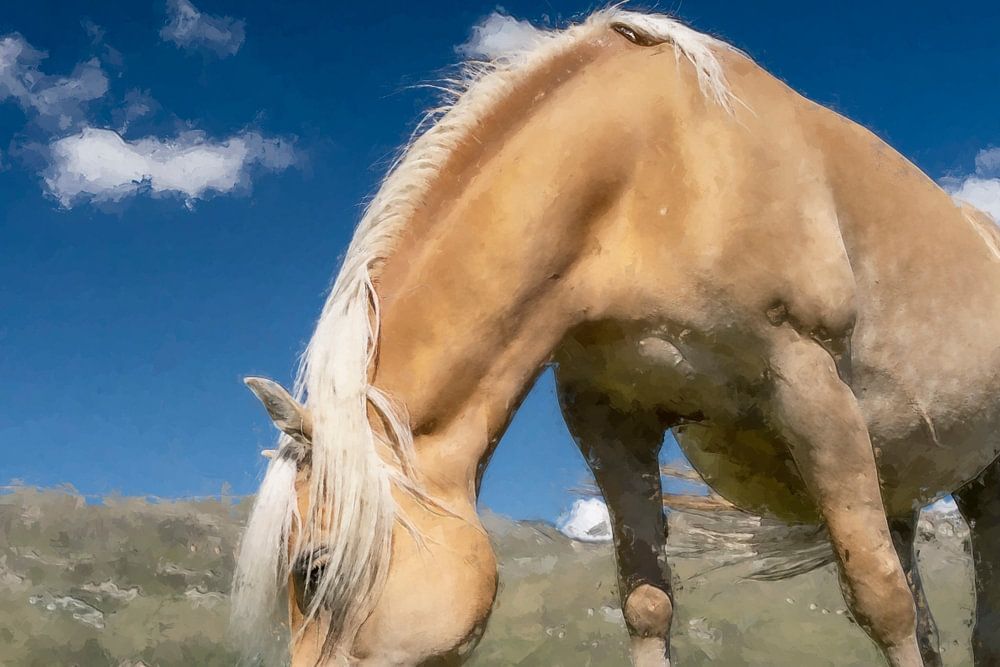 Ein grasendes Pferd auf einer Wiese in Ölfarbenoptik.