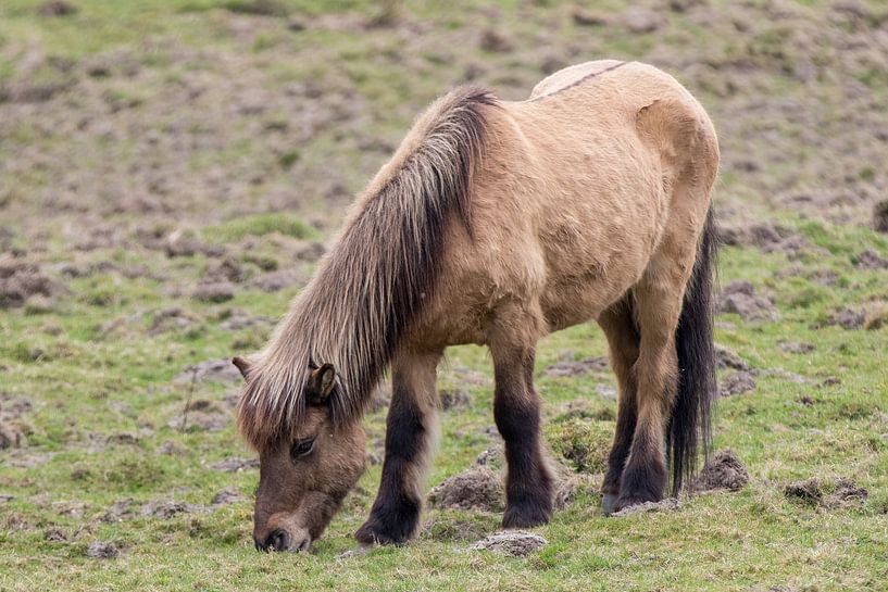 Braunes Pferd steht grasend auf einer großen wilden Wiese im Wald