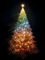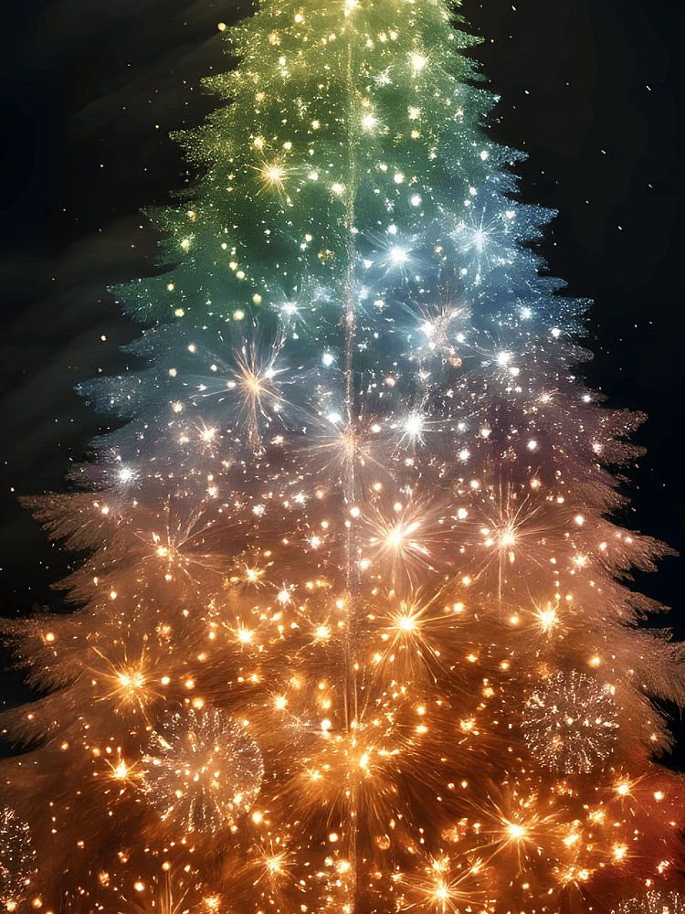 Dieses beeindruckende Kunstwerk zeigt einen Weihnachtsbaum, der aus funkelndem Licht und funkelndem Feuerwerk besteht, und fängt den besonderen Moment ein, in dem Weihnachten und Neujahr aufeinandertreffen. Vor einem tiefschwarzen Hintergrund erhebt sich der…