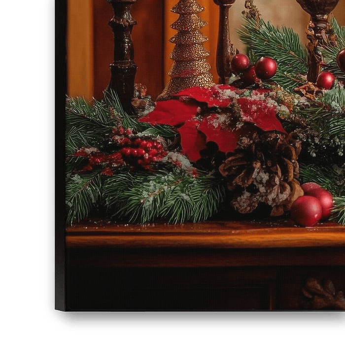 Warm leuchtet das Kerzenlicht zwischen Tannenzweigen und leuchtend roten Weihnachtssternen, während die festliche Anordnung mit Zapfen und Beeren eine einladende Atmosphäre schafft. Diese harmonische Komposition bringt nostalgisches Flair und Gemütlichkeit – perfekt für das Wohnzimmer, um die Vorfreude auf die Feiertage zu zelebrieren.