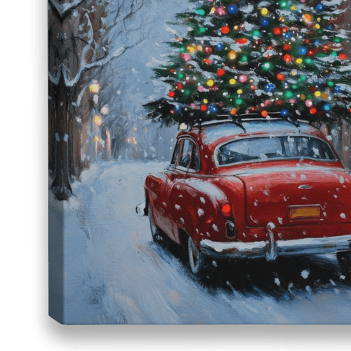 Ein festlich geschmückter Weihnachtsbaum erstrahlt im sanften Licht der bunten Lichter, während Schneeflocken sanft herabfallen und die Straßen in eine malerische Winterlandschaft verwandeln. Ein nostalgisches rotes Auto parkt davor und verleiht der Szene einen Hauch von Retro-Charme, während die Häuser im Hintergrund stimmungsvoll…