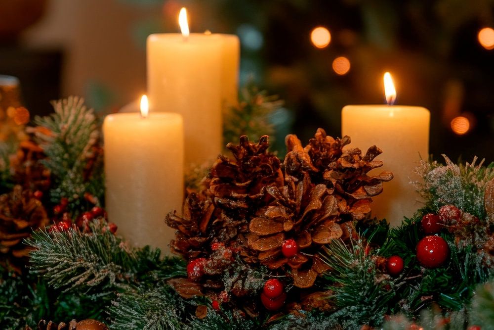 In sanftem Kerzenlicht erstrahlen duftende Tannenzweige, geschmückt mit glitzernden Kugeln und fröhlichen Beeren. Die warmen, goldenen Flammen der Kerzen erzeugen eine einladende Atmosphäre, die zum Verweilen einlädt. Dieses herzliche Arrangement findet seinen perfekten Platz im Wohnzimmer, um festliche Freude und Gemütlichkeit zu verbreiten.