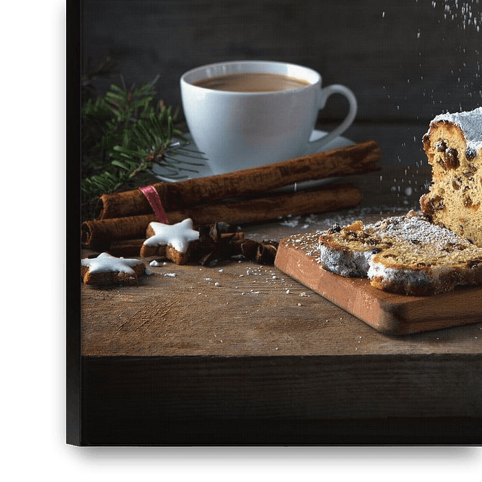 Weihnachtskuchen, in Deutschland wird der Christstollen auf einem rustikalen Holztisch mit Puderzucker, Kaffeetasse, Gewürzen und Zimtsternplätzchen bestreut, dunkler Vintage-Hintergrund mit Kopierfeld, vertikal, ausgewählter Schwerpunkt