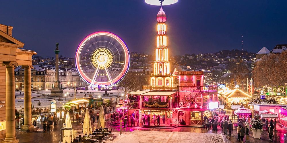 Der Königsbau, das Kunstmuseum und der Weihnachtsmarkt mit Marktständen und Weihnachtspyramide am Schlossplatz in Stuttgart bei Nacht. Im Hintergrund ein Riesenrad vor dem Neuen Schloss, Baden-Württemberg, Stuttgart.