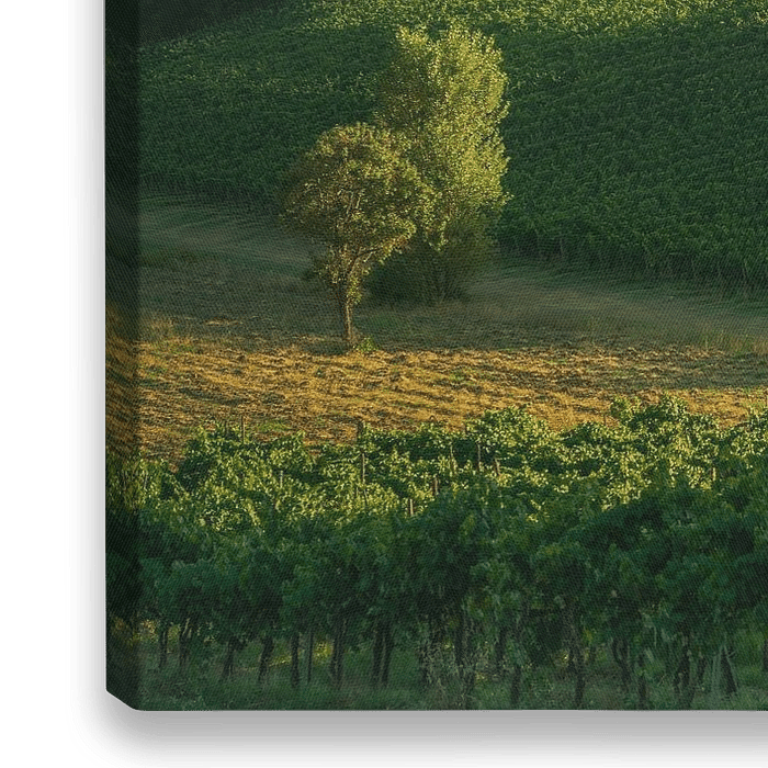 Das Bild wurde bei Sonnenuntergang aufgenommen und hebt das satte Grün der Weinreben im goldenen Licht der untergehenden Sonne hervor, das einen starken Kontrast zu…