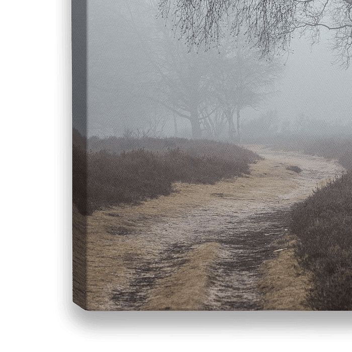 Gesehen an einem frühen Dienstagmorgen in der Westerheide bei Hilversum: ein Weg durch den Nebel, vorbei an traurigen Bäumen mit kahlen, herabhängenden Ästen.