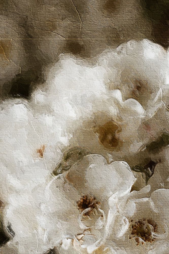 Weiße, neutrale Blumen in abstrakter Form. Dieses Bild wurde aus einer Fotografie erstellt, die digital in ein Ölgemälde umgewandelt wurde. Alte Meister in neuem Gewand!