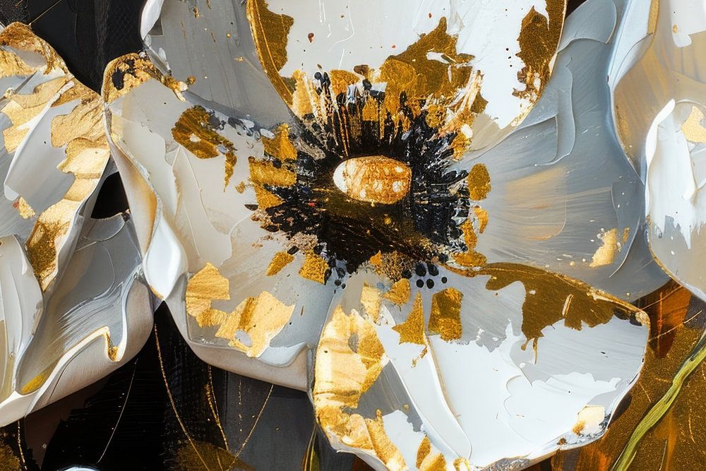 Ein beeindruckendes Blumenbild mit weißen Blumen mit dicker Textur und goldenen Highlights. Der dunkle Hintergrund schafft einen starken Kontrast, der die Blumen sozusagen aus dem Bild heraushebt.