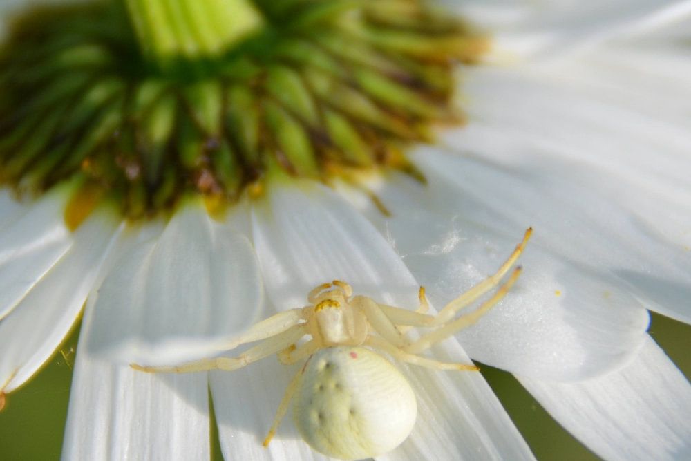 Eine winzige weiße Krabbenspinne auf der Unterseite eines Gänseblümchens. Süd-Limburg, Niederlande