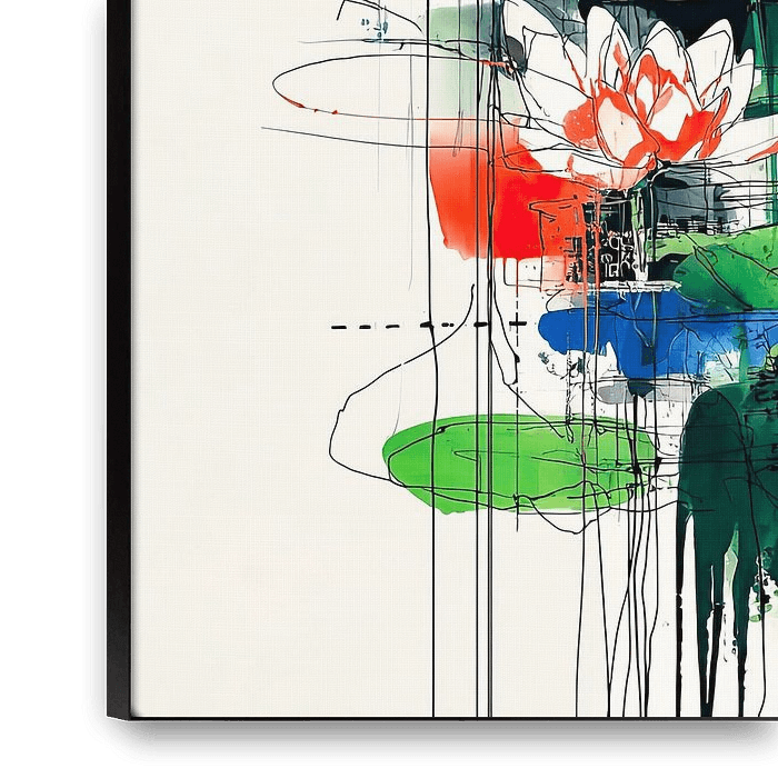 Mehrere weiße Lotusblüten mit korallenroten Zentren liegen auf großen grünen Blättern. Ein feines Liniengerüst zieht sich vertikal und horizontal durch die Szene, stellenweise als kleine Raster. Dünne Tropfspuren laufen nach unten. Links steigt ein weicher Rotverlauf auf, dazwischen liegen ruhige blaue Felder. Elliptische Skizzierlinien…