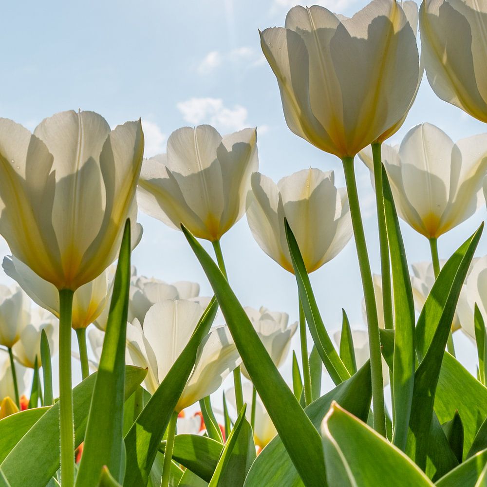 Weiße Tulpen auf einem Feld an einem sonnigen, wolkenlosen Tag.