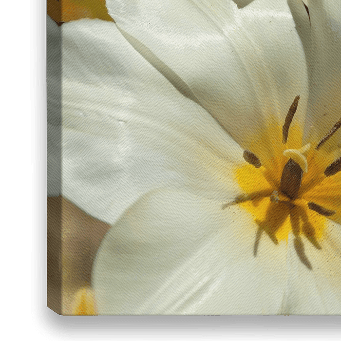 Eine Fotomontage von weißen, offenen Tulpen mit einem Hintergrund aus gelben Tulpen. Eine Nahaufnahme, auf der der Stempel und die Staubgefäße der großen Blüten deutlich zu sehen sind