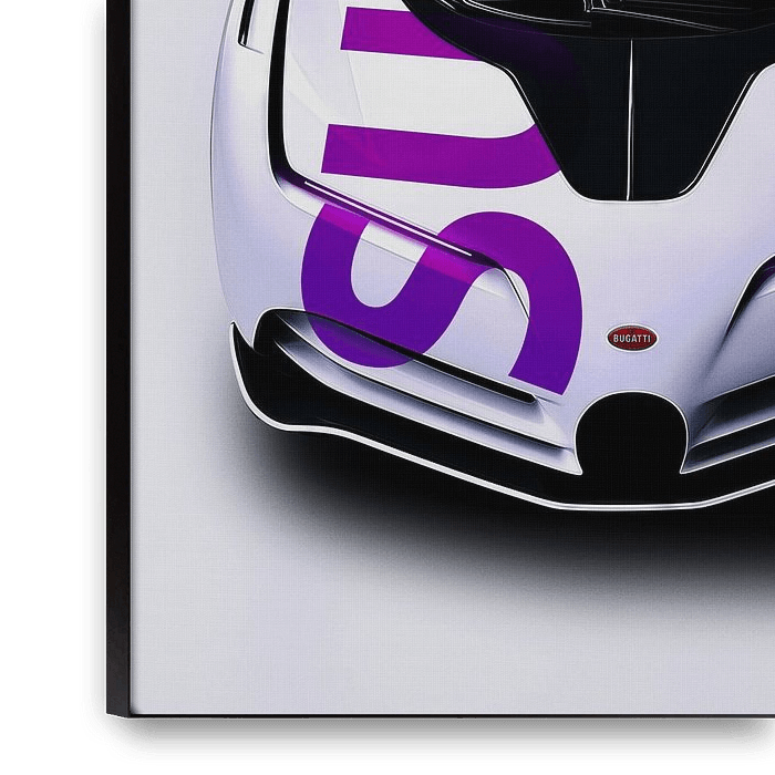 Bestelle dieses abstrakte Wandbild Weißer Bugatti Bolide mit violettem Supreme-Logo von John Dan als Reproduktion auf Leinwand, Alu-Dibond, als Poster, Fototapete oder Acrylglasbild.