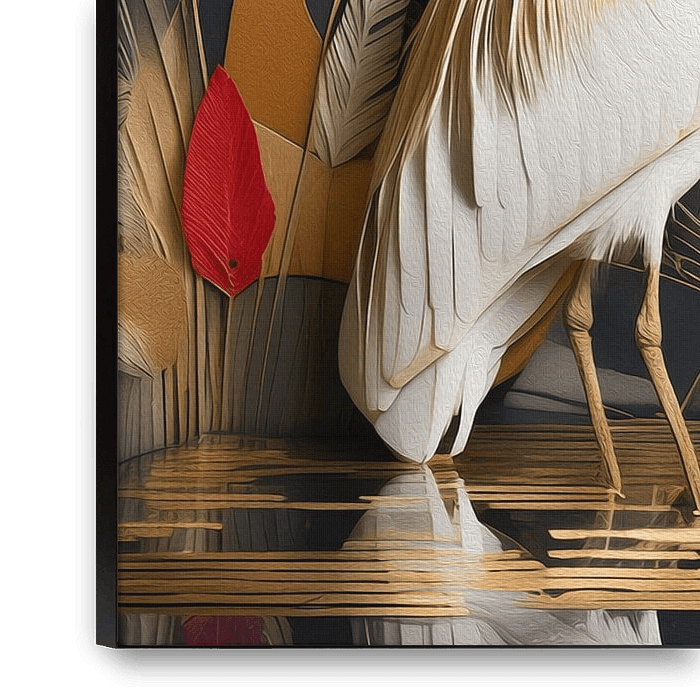 Schickes Kunstwerk mit einem eleganten weißen Reiher. Arbeit in dunkelblauen, hellbraunen, goldweißen und roten Tönen. Dieses kontrastreiche Kunstwerk hat ein quadratisches Format.